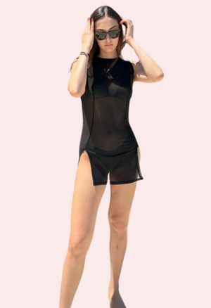 Embrace your bold side with our Sheer Black Mini Dress, featuring dual open slits that add an alluring touch to your look. Crafted from sheer black fabric, this mini dress combines elegance with a hint of daring appeal. The sleeveless design and mini length highlight your silhouette, while the dual slits on either side create movement and showcase your legs. Perfect for evening outings or special occasions, this dress exudes confidence and sophistication, making it a must-have for your wardrobe. Step into the spotlight and command attention with our Sheer Black Mini Dress.
